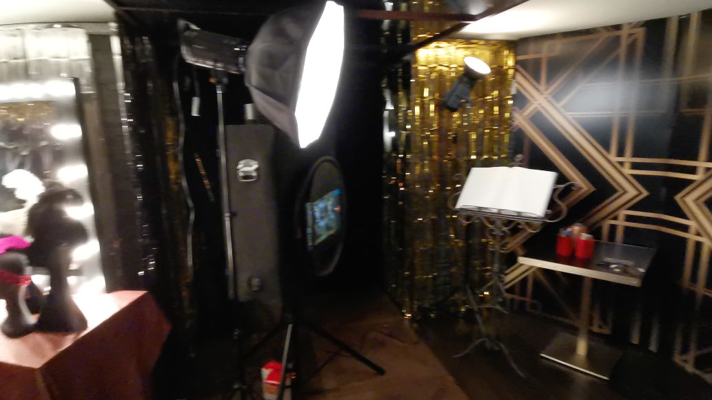 - Sfondo colorato o neutro, con sostegni, area inquadratura Photo Booth