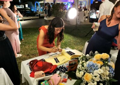 Le stampe vengono consegnate ai presenti, protagonisti di ciascun set fotografico, ed eventualmente inserite nel guestbook cartaceo del cliente, organizzatore dell’evento.